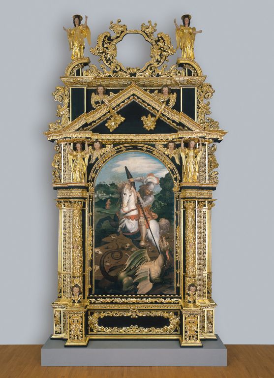 Iz ohranjene fotodokumentacije lahko sklepamo, da je bil celotni oltar, skupaj z manjkajočo zgornjo figuro sv. Mihaela, visok okoli sedem metrov. Oltarna arhitektura je kompozicijsko dovolj jasna. Predela je ravna s podstavki, ki rastejo iz menze. Oltarni nastavek nima ne kril ne krilne niše ali baldahina, stranska dela pa od zunaj navznoter zapolnjujeta dodatna polsteber (pilaster) in steber. Najpomembnejši del oltarja je glavna niša s sliko Sv. Jurij. Glavno nišo obdajata ravna stebra s korintskima kapiteloma. Nad stebroma, v višini segmentnega trikota, sta celopostavni kariatidni angelski figuri, ki nosita trikotno atiko, nad stranskima polstebroma pa je pomanjšano krilo. Ob kariatidnih angelskih figurah zapolnjujeta segmentni trikot krilati angelski glavici, zaključuje pa ga grb, katerega heraldična podoba danes ni več berljiva. Atika je sestavljena iz dveh delov. Nad preklado se dviguje trikotni zaključek z osrednjo sedečo angelsko figuro. Ob zgornjem delu trikotnega zaključka ob plitkih stebrih klečita celopostavni angelski figuri, proti sredini se ob njima ponovi motiv krilatih angelskih glavic. Nad drugo preklado, na pristrešku, stojita angelski figuri, med njima pa masivno hrustančevje obroblja sliko Bog Oče. Glavno nišo velikega oltarja zapolnjuje slika Sv. Jurij v boju z zmajem Hansa Georga Geigerja von Geigerfelda, ki je danes v Narodni galeriji eno izmed ključnih del njene stalne zbirke.