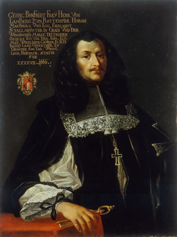Neznani slikar je portretiranca upodobil v skladu s funkcijo, ki jo je opravljal – pod belim čipkastim ovratnikom črnega plašča se blešči križ nemškega viteškega reda, v katerem je Lamberg leta 1664 prevzel mesto komturja avstrijske province. Istega leta je dobil tudi naziv komornika – posebno dedno častno funkcijo, ki jo ponazarja zlat ključ v desnici.