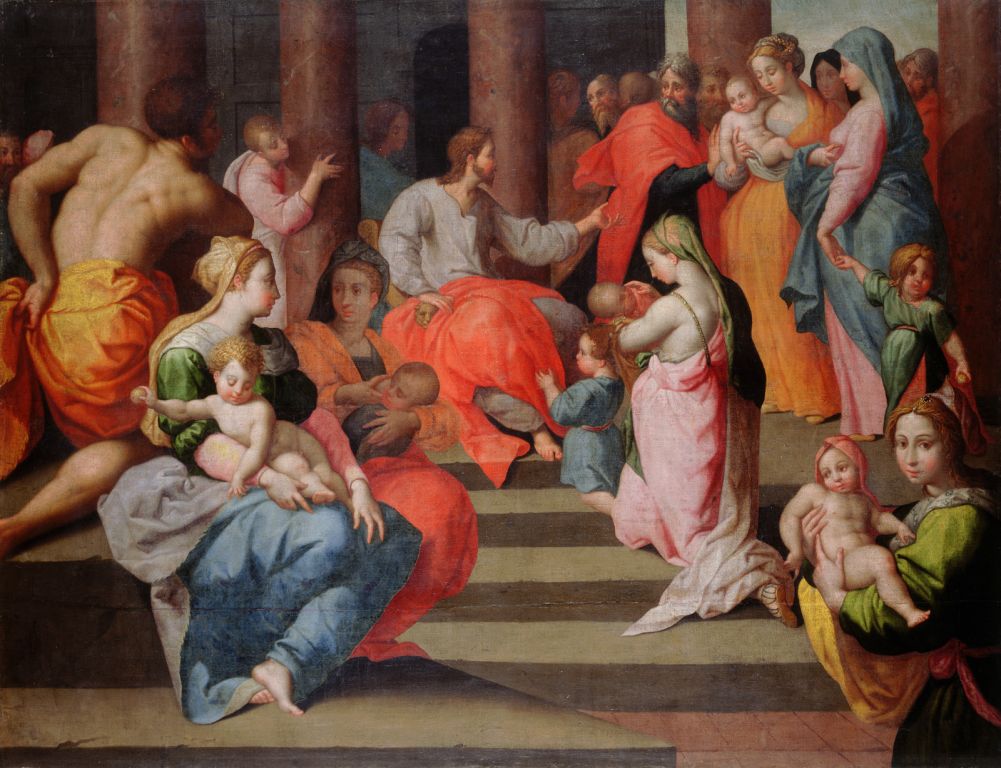 Motiv slike je povzet iz evangelijskih poročil o Jezusu, ki vabi otroke, naj pridejo k njemu. (Mt 19,13-15, Mr 10,13-16, Lk 18,15-18). Otta van Veena je kot avtorja slike mogoče določiti po sorodnosti z nekaterimi deli, ki so prepoznana kot njegova in so vsa iz istega časa slogovnega razvoja okoli 1580–1585. Omenjena skupina vključuje Ljubezen (Caritas) v Art Gallery v Glasgowu (inv. št. 142, pripisano flamski šoli poznega 16. stol.), Čaščenje pastirjev, ki je bilo nekdaj v zbirki Augusta Caracenija v Rimu, Mir in Pravico (Pax et Iustitia) v Staatsgalerie v Augsburgu, Alegorijo izvirnega greha v Staatsgalerie v Bambergu in vrsto slik v zasebnih zbirkah. Sliki v Augsburgu in Bambergu sta uvrščeni v čas okrog 1581. Naša slika kaže veliko prevzetih elementov iz rimskega in florentinskega manierizma, zlasti iz slikarstva Taddea Zuccarija (figura moža na levi) in Pontorma (glave apostolov na desni v ozadju). Motiv prekrižanih nog v skupini žene z otrokom spredaj na levi izhaja iz Pravice (Iustitia) Rafaela in Giulia Romana v Stanza del Costantino v Vatikanu; v otrokovi figuri je drža nog povzeta po Rafaelovi Madoni Bridgewater (Edinburgh, National Gallery of Scotland, last: Duke of Sutherland). Druga različica istega motiva, ki jo je van Veen naslikal na les in temelji na podobni kompoziciji, vendar z mnogimi spremembami, je bila nekdaj (okrog 1950) v zbirki Eduarda Moratille v Parizu (prim. fotografijo G. F. N. Roma, serija C, št. 17831). Po naši sliki (?) je bila posneta stara, vendar nekvalitetna kopija na les, ki jo hrani Galleria Doria-Pamphilj v Rimu, 77 x 108,3 cm, inv. št. 124. Kopija je bila pripisana florentinski šoli (prim. katalog iz 1942), zadnji čas pa neznanemu Flamcu 16. stoletja (prim. katalog iz 1983). V Staatliche Kunsthalle, Karlsruhe, je grisaille na lesu, 33,5 x 47 cm, inv. št. 221. Ni jasno, ali gre za model za ljubljansko sliko. Dr. Nicole Dacos Crifo raziskuje skupino umetnin s tem motivom, ki so pripisane Ottu van Veenu ali pa Jacobu de Backerju (Antwerpen 1540/45–pred 1600), npr. Sinite parvulos, o. pl., Antwerpen, Musée de l'Assistance Publique; nadalje perorisba v rjavem, 21,1 x 30,8 cm, Budimpešta, Szépmüvészeti Múzeum, ali pa perorisba v rjavem, rdečerjave lavure, belo višanje, 33,5 x 44,4 cm, Sotheby's, New York, 1. januar 1990, št. 46.