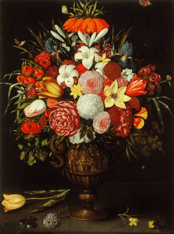 Slika kaže veliko kovinsko vazo, v kateri je sicer urejeno, a brez simetrije razmeščeno cvetje: vrtnice, lilije raznih vrst, dobrovita, zvončnice, tulipani idr. Nekaj cvetov leži na ploskvi, na kateri stoji vaza, okrog cvetov v vazi pa je videti metulje, kačje pastirje in pajka, ki se po niti spušča na ploskev. Vaza je bogato reliefno okrašena: ročaja sta v obliki kač, na sprednji strani je upodobljen mitološki prizor, v katerem je mogoče prepoznati Venero in Amorja in pred Venero še eno klečečo figuro, ki drži v rokah posodo. Ni izključeno, da gre za prizor, ki ga poznamo iz Apulejevih Metamorfoz (VI, 16), ko Psiha prinaša Veneri vodo. Sliko moramo slogovno povezati z domnevnim Mojstrom vaze z groteskami (Maestro del vaso a grottesche, prim. A. Veca: Parádeisos, katalog razstave v Galleria Lorenzelli, Bergamo 1982, str. 211, sl. XIX-XXII). Vse slike tega mojstra kažejo velike šopke cvetja (ki so zelo podobni šopku na naši sliki tako po razmestitvi kot po izbiri cvetja) v kovinskih vazah, ki imajo nenavadne ročaje in so okrašene s posvetnimi ali sakralnimi prizori ali pa s krajinami. Na teh slikah je opazen vpliv flamskega cvetličnega tihožitja na prehodu iz 16. v 17. stoletje, pri čemer je posebej značilen cvet cesarskega tulipana (Fritillaria imperialis); tega pogosto najdemo na flamskih slikah, na naši pa je naslikan prav v vrhu kompozicije. Čeprav so nekatere slike iz omenjene skupine skušali povezati z Giacomom Reccom, Veca misli, da je treba njihovega avtorja iskati nekje v srednji ali severni Italiji. Zadnja lokalizacija se zdi bolj verjetna; k njej nas usmerjajo nekatere slike, ki so kompozicijsko analogne in z vazami cvetja sorodne z nedvomnim lombardskim delom. Posebej je v tej zvezi značilna velika slika na platnu s figurama Marte in Marije na vsaki strani vaze s cvetjem; delo je bilo 20. februarja 1981 naprodaj na dražbi Christie's v Londonu (št. 97). Obe figuri izhajata od Bernardina Luinija. Na podnožju vaze na naši sliki je desno napis BOS 880, ki ga ni mogoče zadovoljivo pojasniti; verjetno je bil dodan pozneje, morda kot inventarna oznaka.
