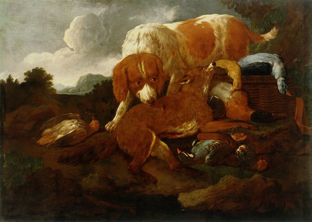Španski ptičar s skoraj počlovečenim izrazom ovohava uplenjeno divjačino. Podoba je tipična za slikarski repertoar Domenica Brandija in mnoge njegove umetnine bi lahko primerjali z njo. Izgleda, da je bil vzorec za to sliko svobodna predelava enega temeljnih del Jacopa Bassana, zdaj v Louvru, ki predstavlja dva psa (61 x 79,5 cm). Na Brandija kaže stanje ohranitve. Temni temeljnik je tone zelo spremenil, tako da slika, ki je morala biti svoj čas dokaj svetla, danes zveni v rjavem tonu. V njem se izgubljajo barvna razmerja, ki jih je umetnik želel doseči. Ob tem, kar vemo danes o umetniku, je nemogoče predlagati določnejšo datacijo; še najverjetneje je slika nastala med leti 1720 in 1735. Replika slike manjših mer, 73,5 x 96 cm, je v zasebni lasti v Ljubljani. Musée des Beaux-Arts v Orléansu hrani Brandijevo umetnino Lovska oprema, psa, zajec in ptica, 96 x 132 cm, inv. št. 1298, ki spominja na ljubljanska primerka. Pripisana je bila slikarju de Conincku in italijanski šoli druge polovice 17. stoletja. Sliki enakega naslova in enakih mer, Psi in divjačina, 94,6 x 133 cm, ki sta tudi sorodni ljubljanskima, sta bili pripisani krogu Baldassareja di Caroja in prodani v Londonu, Christie's 19. april 1996, št. 207 A in 207 B.