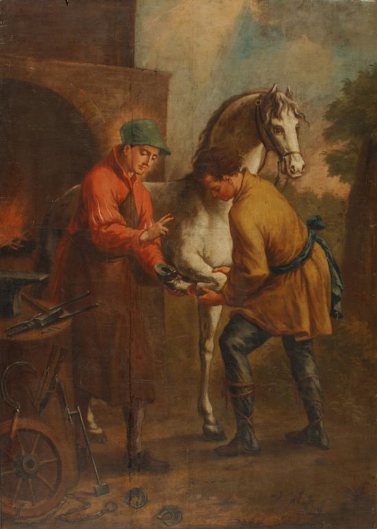 Sv. Eligij je bil kovač in zlatar,tako dober, da je znal iz enake količine zlata napraviti kar dva dragocena prestola namesto enega in je pridobil občudovanje francoskega kralja Klotarja II.in kasneje Dagoberta I., ki sta mu zaupala tudi vodenje kraljeve kovnice. Leopold Layer pa je upodobil še eno zanimivo žanrsko zasnovano legendo iz svetnikovega življenja. Zgodba ga predstavlja kot izjemno iznajdljivega in izurjenega kovača. Svetniku so namreč pripeljali konja, ki je bil tako podivjan, da ga nikomur ni uspelo podkovati. Eligij pa je konju odstranil nogo, jo podkoval in jo nato pritrdil nazaj. Tako je postal zaščitnik kovačev, zlatarjev, kočijažev in veterinarjev.