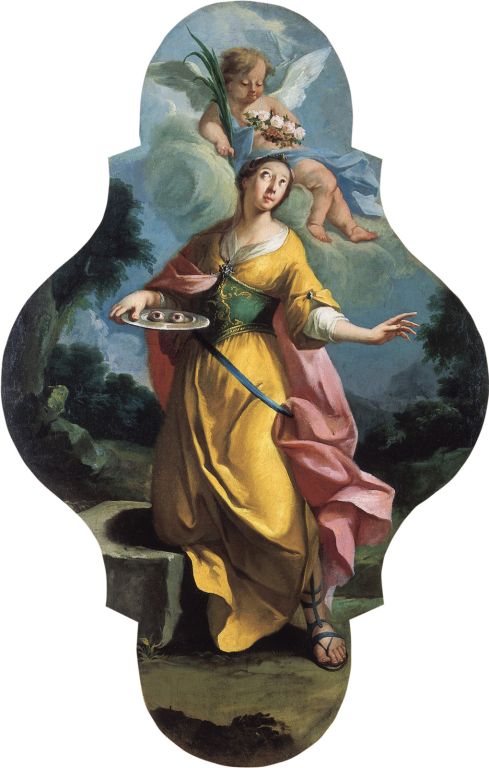 Ozki ovalni obrazi z nizkim čelom in pogledom, usmerjenim proti nebu, so značilni za upodobitve Metzingerjevih svetnic. Podobno kompozicijsko zasnovo srečujemo pri sliki Sv. Lucijaiz cerkve v Štepanji vasi (NG S 273) in drugih upodobitvah sv. Lucije v slikarjevem opusu.