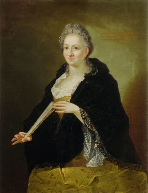 Vsi trije portreti Erbergov so prvotno viseli v dvorcu v Dolu. Baron Erberg se je leta 1761 poročil z dobrih trideset let mlajšo Ano Marijo, rojeno grofico Neuhaus (1744–1774). Najbrž sta bila kmalu po poroki naslikana tudi njuna portreta, to pa pomeni, da Ana Marija ob njunem nastanku ni imela več kakor dvajset let. Sivi lasje tako ne izpričujejo njene starosti, ampak govorijo o takratni modni muhi. Da bi imeli moderno sivo pričesko, so si tako dame kakor gospodje pudrali lase (ali lasulje). Uporabljali so siv puder v prahu, lase pa so si pred pudranjem natrli s posebnim mazilom. Tako so bili zaradi sivih napudranih pričesk vsi videti stari.