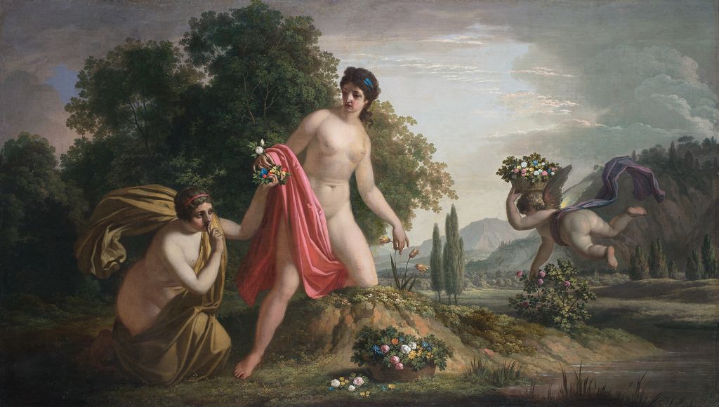 Venera ( gr. Afrodita ), boginja cvetja, vrtov in ljubezni je nekoč tekmovala s svojim krilatim sinom Kupidom ( Amorjem ). Sredi cvetoče pokrajine sta stavila, kdo bo nabral več cvetja. Amor je letal od cveta do cveta in Veneri je slabo kazalo. Skrivoma ji je prišla na pomoč nimfa Peristera in Venera je zmagala. Amor je spregledal prevaro in je nimfo za kazen spremenil v goloba ( peristera je starogrška beseda za goloba ). Odslej je golob Venero zvesto spremljal in je postal eden njenih atributov. O Peristeri je Boccacio vedel povedati, da je menda bila lahkotna ženska iz Korinta, ki je po zunanjosti in lepoti hotela tekmovati z Venero.