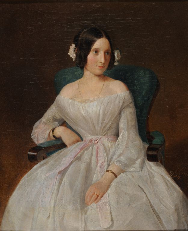 Tričetrtinski portret mlade dame je naslikan preprosto in sofisticirano. Slika ne vsebuje nobenih odvečnih predmetov, ki bi odtegnili gledalčevo pozornost s portretiranke. Stvarna okoliščina oziroma zavestna izbira, ki vpliva na racionalizacijo predmetov, je tudi majhen format slike. Upodobljenka sedi v naslanjaču s hrbtnim naslonjalom, ki barvno podpira in poudarja modre oči, te pa oživljajo obraz z natančno naslikanimi portretnimi potezami. Obraz, dekolte in roke so naslikane v nežni rožnati barvi, rahla rdečica pa izkazuje cvetoče zdravje in tudi rahlo zadrego, ki je bila v patriarhalni družbi zaželena odlika mladih dam, tudi pravkar poročenih. Pričeska in obleka sta značilni za štirideseta leta 19. stoletja. Lasje so centralno razdeljeni in delno v spirali padajo ob obrazu, medtem ko so preostali lasje tesno zviti na zatilju. Obleka v beli barvi, ki je bila zelo priljubljena barva večernih oblek, razkriva gola ramena, rokavi pa se brez odvečnih dodatkov spuščajo v rahlo zvončasto obliko. Celotno sliko obvladuje svetloba dragocene tkanine slavnostne obleke, ki z ozkim pasom poudarja eteričnost upodobljenke, ki je navkljub bidermajerski tipiziranosti videti živo prisotna.