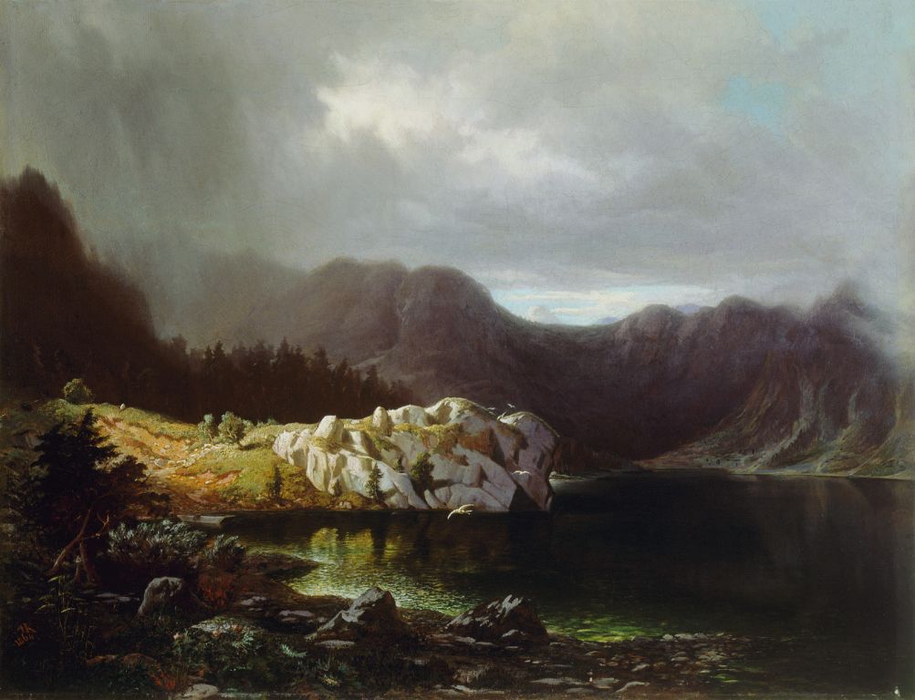 Slikar je bil očaran nad dramatično prednevihtno sceno Klanškega jezera. Napetost v pokrajini izražajo grozeči oblaki, soparne meglice, temačna jezerska gladina, mogočne smreke, izpostavljene skale in gorska gmota v ozadju. Razgibanost naravnih oblik je stopnjevana še s kontrastno osvetlitvijo prizora in s slikarjevim značilnim slikanjem vode in odsevov. Nizko nad gladino poletavajoči ptiči dodajo ujetemu trenutku v mogočni naravi še zadnji romantični poudarek. Karinger je v enakem izrezu zajel pogled na jezero tudi v akvarelu, le da je razpoloženje tam bolj optimistično – z mavrico po nevihti.