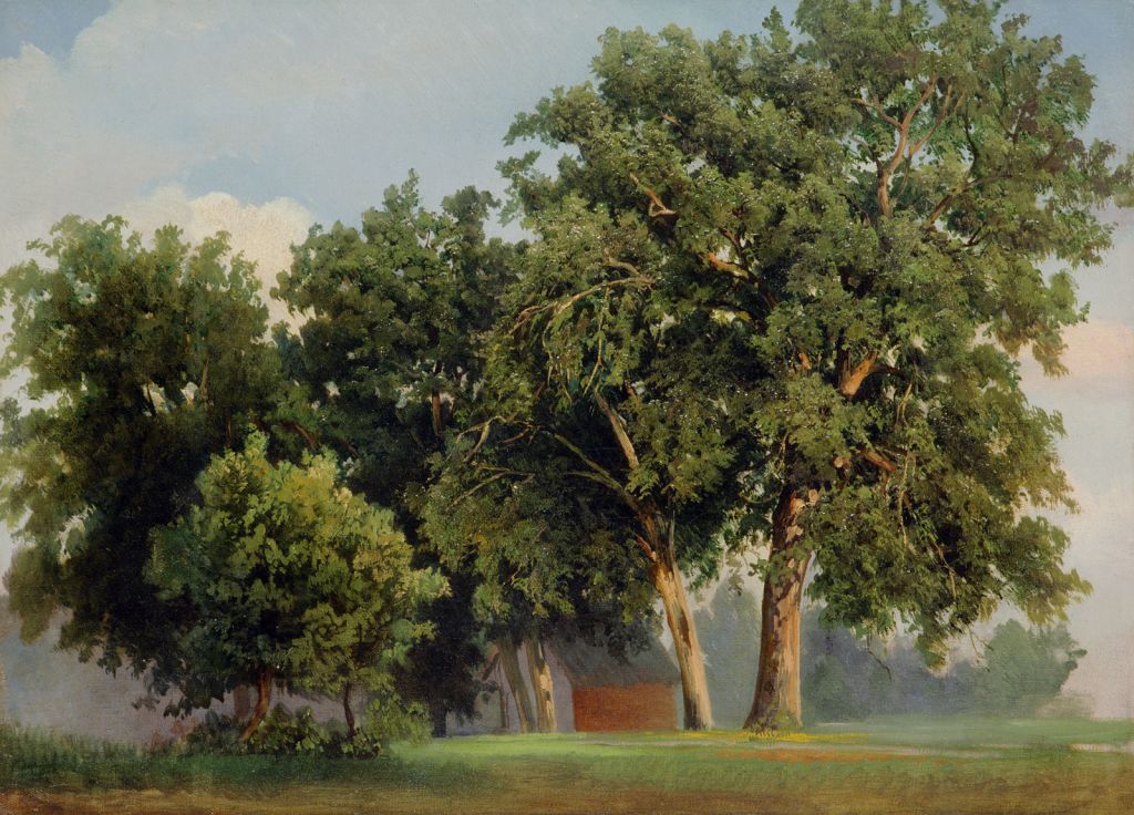 Krošnje dreves se prepletajo, medtem ko so debla vsaksebi. Na travniku okoli dreves opazimo rumene cvetlice, nekaj podrastja, za drevesi tudi skromno kočo. Podoba je verjetno nastala po Karingerjevih sprehodih v Mestnem logu, južno od mesta, kjer se že začenja Ljubljansko barje. V istem obdobju je Karinger večkrat upodobil gozdnato, gorsko in skalnato krajino. Katere podobe so nastale pred motivom oz. v kolikšni meri, težje določimo, saj je Karinger vestno skiciral drevesa in posamične naravne motive in vsaj pri slikah prepoznavne krajine lahko opazimo, kako zelo je motiv prilagajal lastnemu slogu in izrazu.