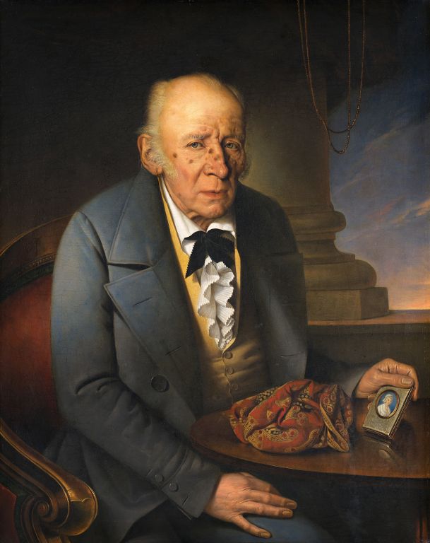 Uspešni goriški trgovec z železnino Jožef Tominc (1768−1852) je bil dvakrat poročen in je dvakrat ovdovel. V prvem zakonu z Marijano Janežič se je rodil slikar tega portreta. Oče se je prav odločil, ko je kljub svoji pridobitniški naravi nadarjenemu sinu priskrbel ugledno štipendijo za šolanje na akademiji Sv. Luka v Rimu. Izjemni realizem portreta z neprizanesljivo upodobitvijo starosti in usihanja življenja sta dovoljevali intimna bližina med očetom in sinom in hkrati slikarjeva zavezanost objektivnemu slikanju obrazne topografije. Učinek še stopnjuje žareča svetloba, ki pada na obraz in na levo ramo, ustvarja videz čvrste telesnosti in deluje skoraj hiperrealistično. Ostareli Tominc v rokah drži tobačnico z miniaturnim portretom prve žene, ki odseva tudi v mojstrsko naslikani zloščeni površini mize, ob njej pa je še kašmirski šal, nekoč verjetno pokojničin. Skupaj s slikarjem, ki stoji pred sliko, je družina navidezno spet združena. V zapuščini družine Šantel − slikarka Avgusta Šantel st. je bila nečakinja slikarja Tominca − sta se menda ohranili varianta portreta in tudi tobačnica z miniaturno upodobitvijo Marijane Janežič.