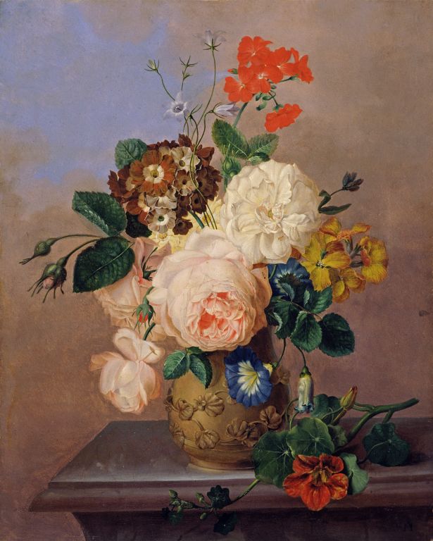 Šopek cvetlic na sliki je bil nabran konec maja in v začetku junija. Na samem vrhu šopka je vejica cinobrasto rdeče pelargonije, ki v paru s kapucinko, odloženo na polici, daje intenziven barvni poudarek celotnemu tihožitju, ki je pretežno sestavljeno iz cvetlic umirjenih barv. V sredino šopka so vstavljene vrtnice, zgornji beli cvet vrtnice je cvet bele rože, spodnji trije cvetovi pa pripadajo vrtnici stolistnici. V višini bele vrtnice je postavljen svetlo rjavi avrikelj, za katerim je delno vidna še bledo rumena različica iste cvetlice. Cvet rumene barve na desni strani šopka je zlati šeboj, ki lepo diši in privablja žuželke. Šopek je barvno uravnotežen s tribarvnim slakom, cvetovi zvončice ob pelargoniji in drobnimi spominčicami nad šebojem. Cvetlice različnih oblik in barv so harmonično razporejene v trebušasti vazi z reliefnim vzorcem. Profilirana polica, na katero je postavljena vaza s cvetjem, je eden izmed osnovnih elementov dunajske slikarske šole tihožitij prve polovice 19. stoletja, ki jo je slikarka, ljubiteljicavrtnarstva in botanike, zelo dobro poznala.