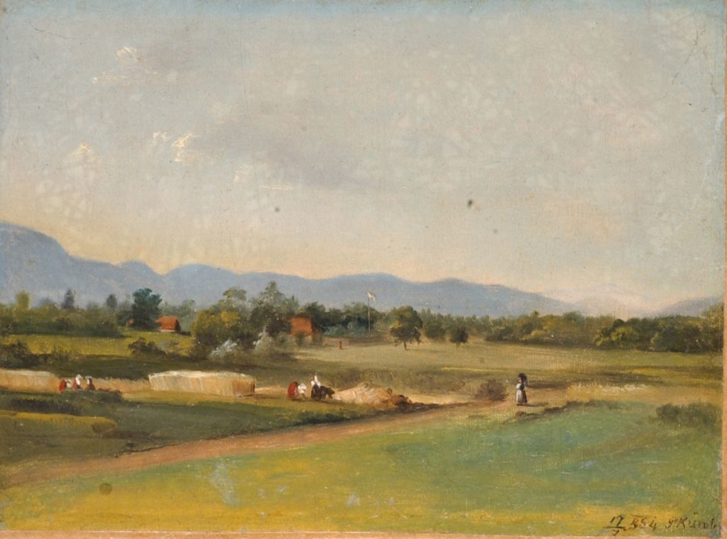 Na drobni podobi žene v kmečkih oblačilih spravljajo žito. Dobro polovico slike obvladujejo jasno nebo in oddaljeni hribi. Künl je v svojo skicirko zabeležil več krajev okoli Ljubljane, na majhno platno pa prelil tudi pastoralno sceno iz šentpetrskega predmestja.