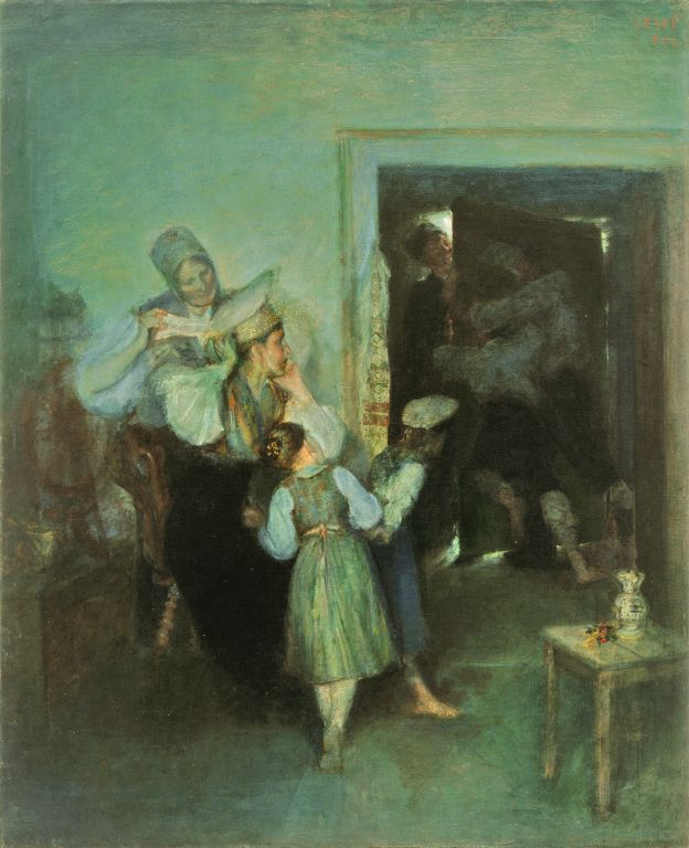 Na levi nevesto ženska in dekleti pripravljajo na obred, na desni poskuša v sobo (kot po nekaterih običajih) vdreti moški. Slika je polna domoznanskih podrobnosti: noša neveste, vzorčast kos blaga na podboju vrat, majolika in mali šopek na stolu na desni. Etnografski motiv se zaradi melanholičnih modro-zelenih tonov, ki so v kontrastu z domnevno veselim vzdušjem, zdi simbolističen. Po vtisu in motivu neveste delo spominja na