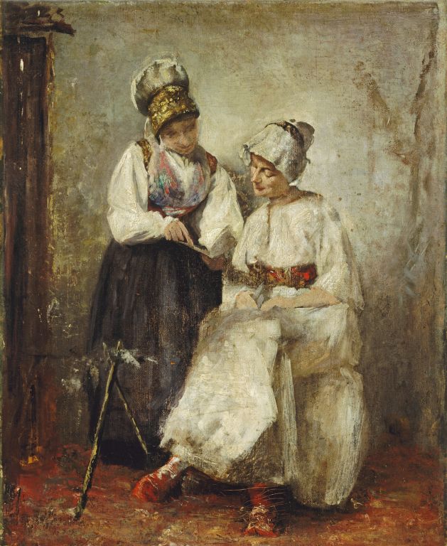 Prijateljici). Vesela so noše pritegnile že kot otroka, zbirati pa jih je začel po zgledu živinozdravnika Sadnikarja; z njim in Ivano Kobilca je med študijskimi počitnicami hodil po deželi in beležil lokalne značilnosti. Sliko lahko po narodopisni tematiki vzporejamo s kasnejšo podobo
