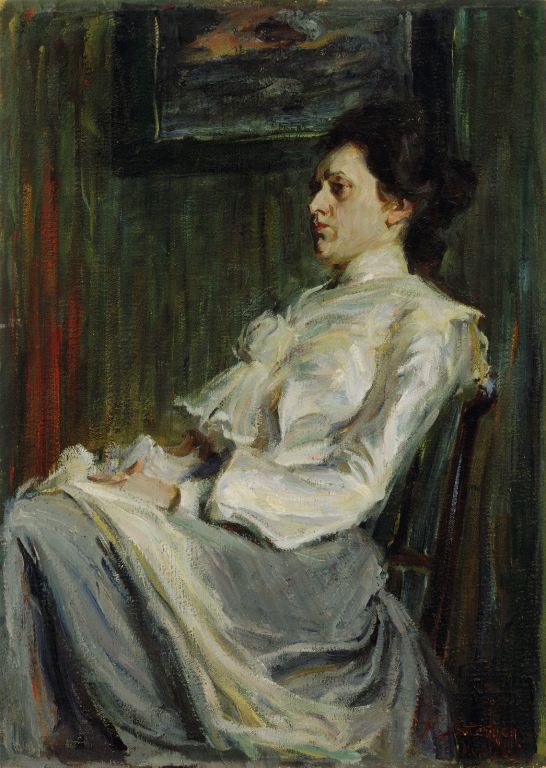 Portret predstavlja poznejšo slikarjevo ženo in slikarko, rojeno 15. avgusta 1867 v Ljubljani in tu umrlo 20. decembra 1956. Tudi ona je študirala v Ažbetovi slikarski šoli, se tu spoznala s Sternenom in se z njim 1907 v Münchnu poročila. Sternenovi biografi štejejo portret Roze Klein upravičeno za slikarjev vidnejši dosežek iz münchenskega časa. Portretni opis preglaša interieurska in barvna " štimunga "; čeprav naj bi začetek " impresionistične " faze slikarjevega razvoja padel šele v leta po 1904, je ta portret pravo bogatstvo živo opazovanih odtenkov bele, sive in modre barve, ki jih stopnjuje in virtuozno vnaša v celoto.
