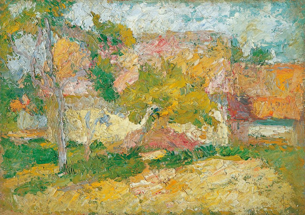 Jakopičeva mala slika kmečke hiše z gospodarskim poslopjem pod drevjem je sijajna pleneristična študija z Barja ali morda celo iz Stranske vasi, ki jo odlikuje izjemna svežina. Dovolj razdrobljena, neurejena, improvizirana faktura daje vtis naglice gradnje slikovne površine v enakomerno opno. Kompozicija je zgrajena v zaporedju oblik, vzporednih s površino slike kot bi njen format odmeval v globino podobe. Bela stena z rožnato streho še spominja na zgodnejše problemsko zastavljene kompozicije, ki jih najdemo pri Mateju Sternenu, Ivanu Groharju in celo v fotografiji Avgusta Bertholda. Primerjava z izvedbo v galerijskem formatu iz zasebne lasti nas pouči kako dragoceno je ekstatično doživetje v živem stiku z motivom. Jakopič je svetlobnemu spektaklu narave učinkovito prilagodil svoj slikarski izvedbeni aparat in ustvaril trenutni vtis, ki ga preprosto ni mogoče ponoviti.