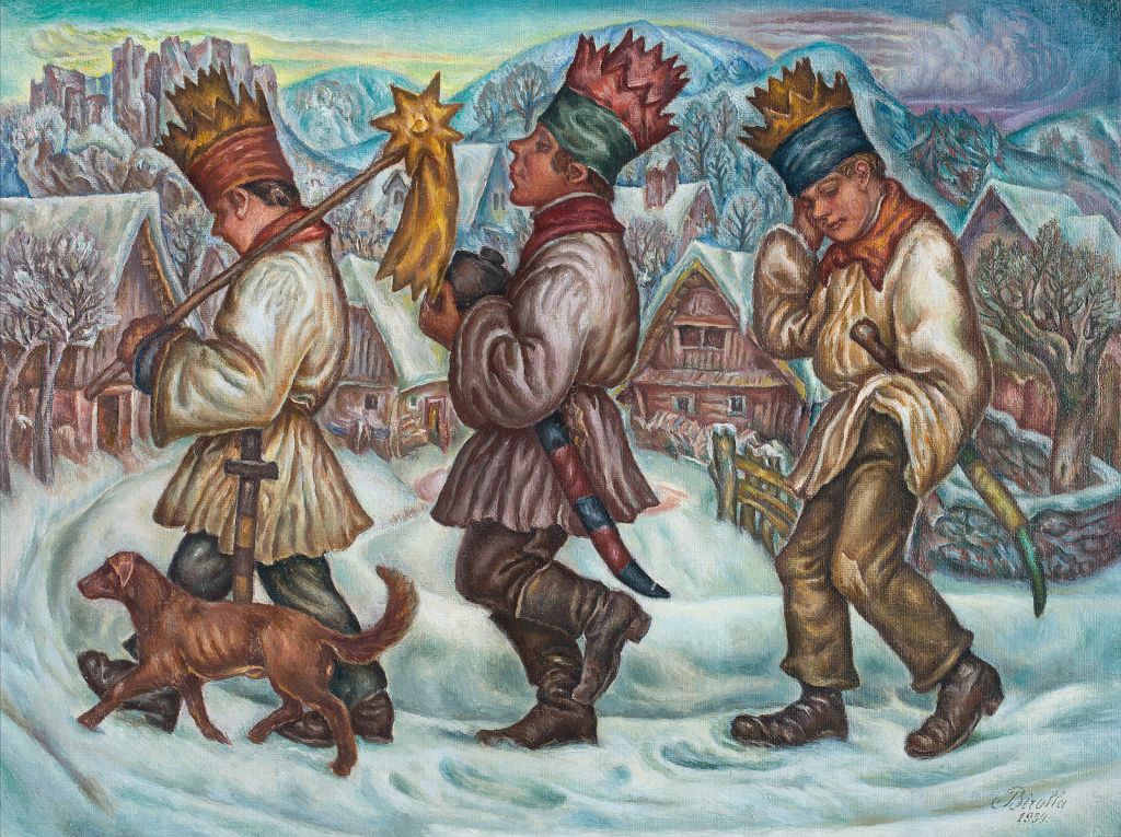 Na sliki je upodobljena šega, kako v božičnem času po vaseh hodijo trikraljevski koledniki. To so bili vaški fantje, ki so se preoblekli v svete tri kralje, hodili od hiše do hiše in prepevali kolednice. Njihov prihod je prinašal srečo, zdravje in dobro letino. Prejete darove so izročili revnim družinam z otroki ali pa so jih skupaj pojedli in popili. Slikar jih je upodobil v prvem planu, vsi nosijo krone in opremljeni so z meči. Prvi kolednik nosi čez ramo zvezdo repatico, drugi ima v rokah posodo s kadilom, tretji pa se čoha za ušesom. Na pohodu proti pravljični zasneženi vasici se jim pridruži še pes. Celotni prizor je naslikan z vijugastimi linijami, značilnimi za slikarja Birolla; te linije spominjajo na stare lesoreze in dajejo sliki pridih nostalgije.