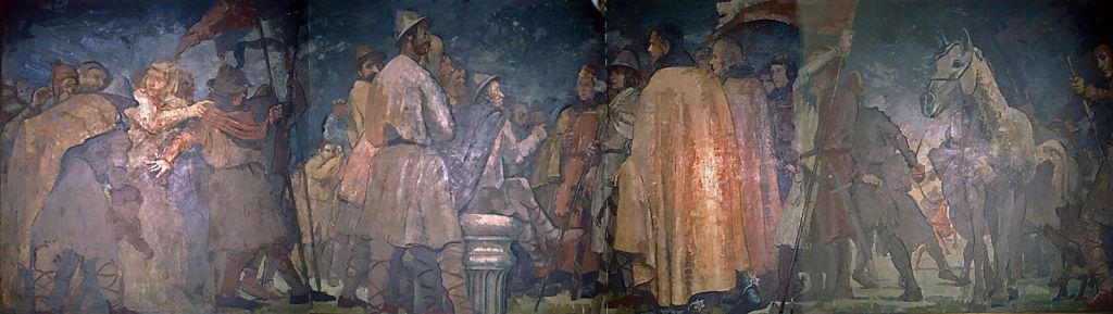 Na natečaju je zmagal Gojmir Anton Kos (1896–1970), ki je dokončani cikel predstavil v Jakopičevem paviljonu junija 1940. Kos si je pri slikanju pomagal s prvim delom Avstrijske rimane kronike Otokarja iz Geule iz začetka 14. stoletja, svetoval pa mu je tudi brat Milko Kos, profesor zgodovine na ljubljanski univerzi. Umestitevje del ciklusa sedmih monumentalnih slik, ki je bil umeščen na hodnik pred reprezentančnimi prostori v prvem nadstropju banske palače v Ljubljani (današnje Predsedniške palače).