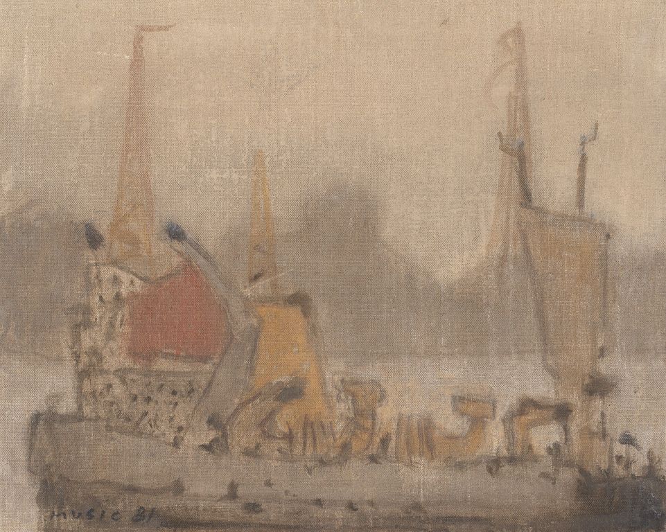 sign. in dat. l. sp.: MUSIC 81, sign. in dat. na hrbtni strani platna: MUSIC / Nave alle / Zattere /olio 1981 / 6 F