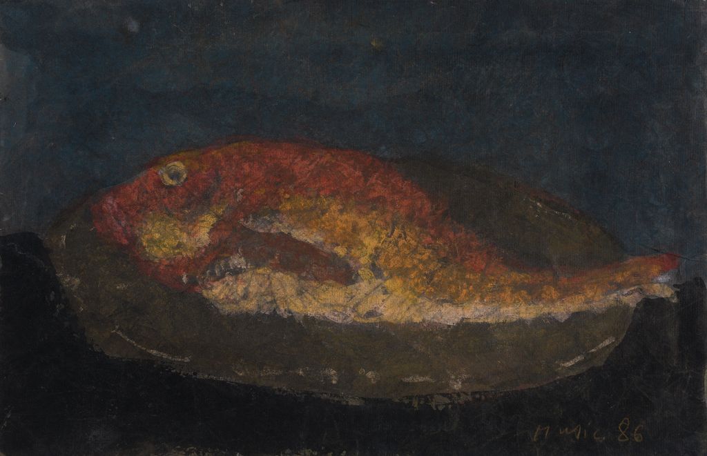 Ribe so – poleg školjk – Mušičev priljubljen motiv tihožitij z morskimi sadeži, ki jih postavi na krožnik. Slikal jih je že v tridesetih in štiridesetih letih 20. stoletja, saj je bil uveljavljen motiv pri slikarjih zagrebške šole. Takrat so bile to najpogosteje sardine oziroma slaniki, na katerih je raziskoval srebrn lesk lusk.