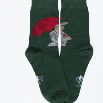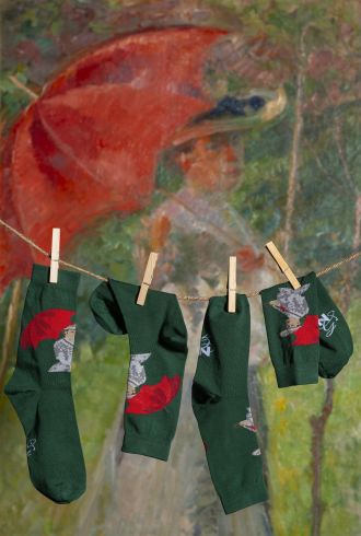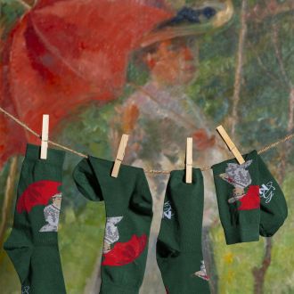 Galerijske nogavice z motivoma Rdeči parazol in Kofetarica prinašajo košček slovenske umetnosti v vaš vsakdan. Navdihnjene z znamenitima deloma Mateja Sternena in Ivane Kobilca, te nogavice združujejo eleganco umetniškega izraza in udobje sodobnega oblikovanja.