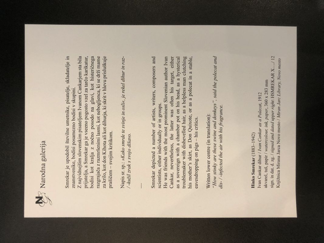 Smrekar je upodobil številne umetnike, pisatelje, skladatelje in znanstvenike, bodisi posamezno bodisi v skupini. Z najvidnejšim slovenskim pisateljem Ivanom Cankarjem sta bila prijatelja, a Smrekar ga je vseeno pogosto vzel za tarčo karikatur, bodisi kot kralja z nočno posodo na glavi, kot histeričnega razgrajača z razmršenimi lasmi, kot nebogljenca, ki se drži mame za krilo, kot don Kihota ali kot dihurja, ki skrit v hlevu prisluškuje prašičem – svojim kritikom.