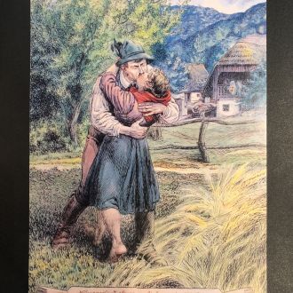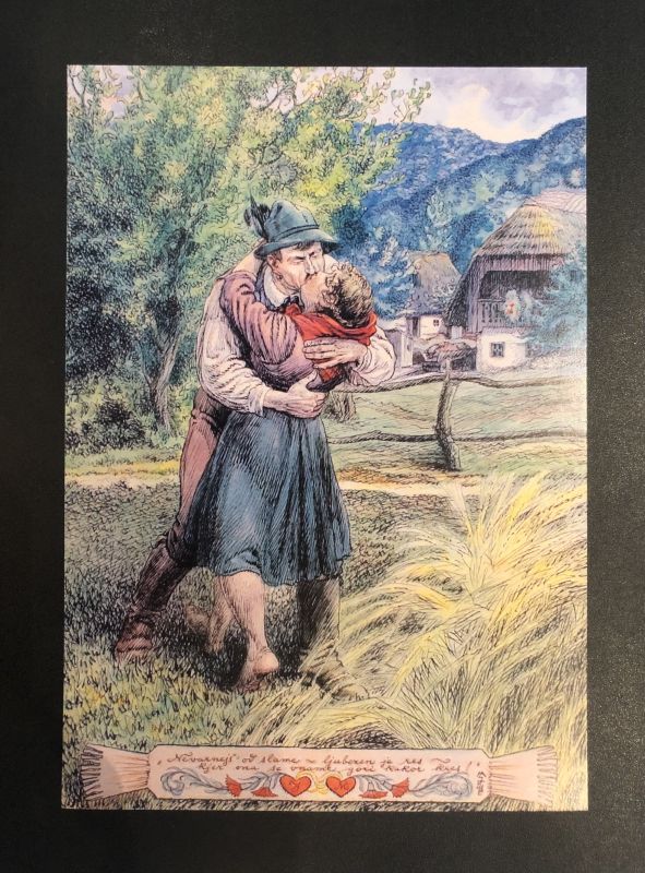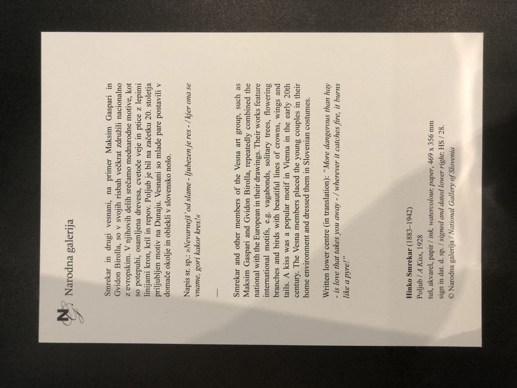 Smrekar in drugi vesnani, na primer Maksim Gaspari in Gvidon Birolla, so v svojih risbah večkrat združili nacionalno z evropskim. V njihovih delih srečamo mednarodne motive, kot so potepuhi, osamljena drevesa, cvetoče veje in ptice z lepimi linijami kron, kril in repov. Poljub je bil na začetku 20. stoletja priljubljen motiv na Dunaju. Vesnani so mlade pare postavili v domače okolje in oblekli v slovensko nošo.