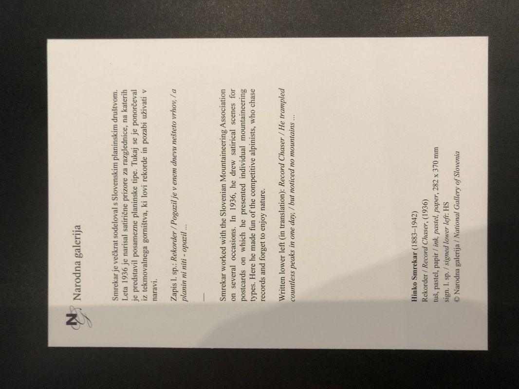 Smrekar je večkrat sodeloval s Slovenskim planinskim društvom. Leta 1936 je narisal satirične prizore za razglednice, na katerih je predstavil posamezne planinske tipe. Tukaj se je ponorčeval iz tekmovalnega gorništva, ki lovi rekorde in pozabi uživati v naravi.