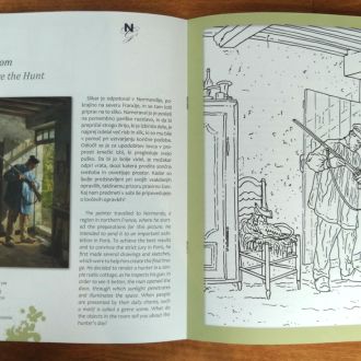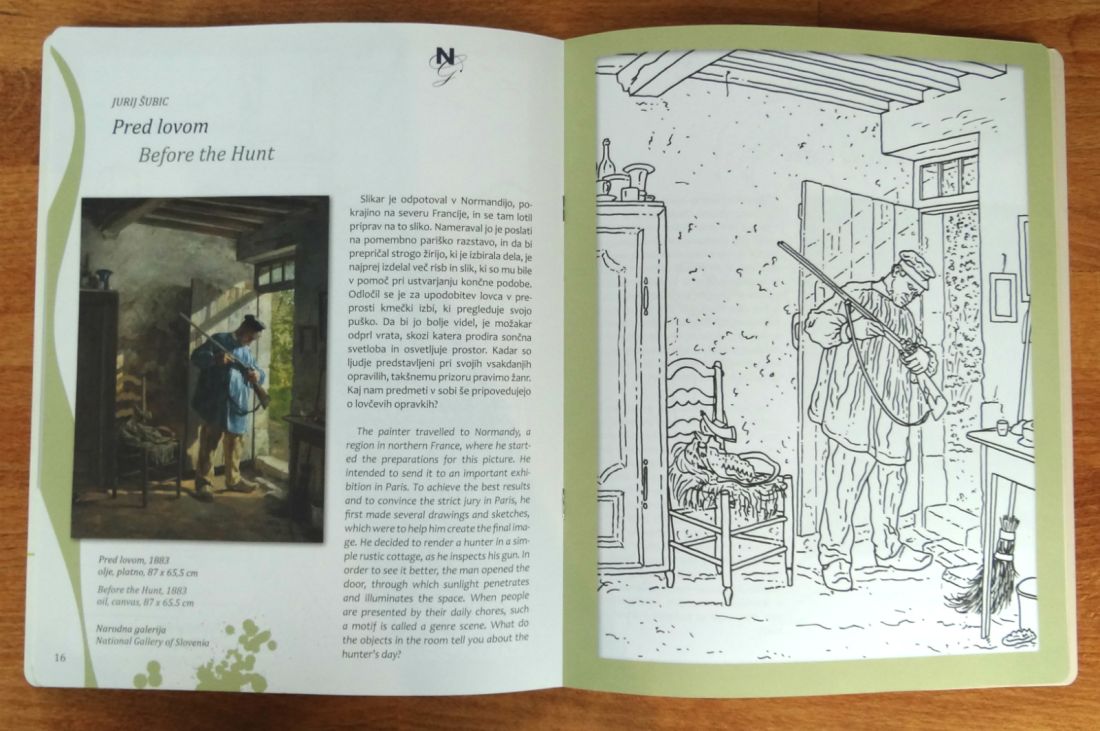 V pobarvanki so predstavljene izbrane umetnine Narodne galerije. Ob vsaki sliki je opis, v katerem je na kratko razloženo, kaj je na njej upodobljeno in vam obenem razkriva še kakšno zanimivost o njenem nastanku ali umetniku, ki jo je ustvaril. Opis lahko preberete tudi v angleškem jeziku in se pri tem naučite novih besed.