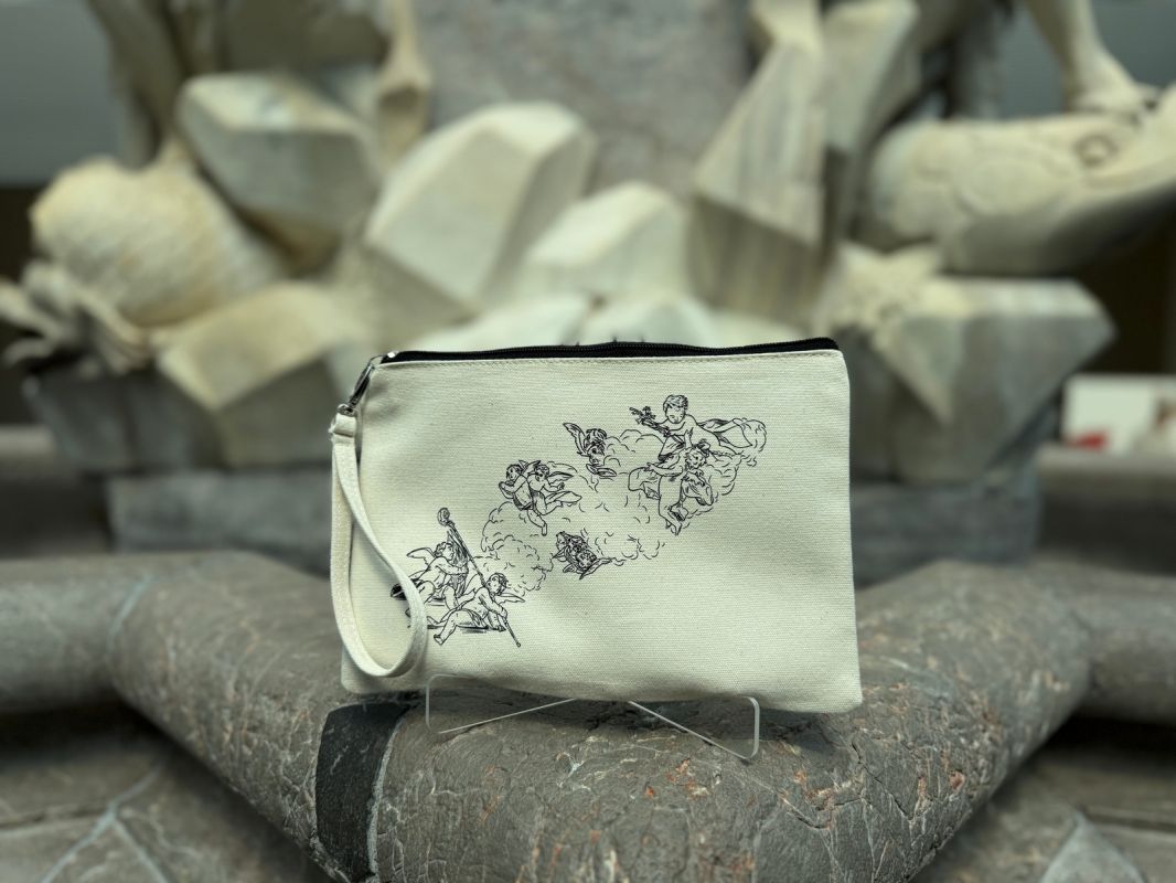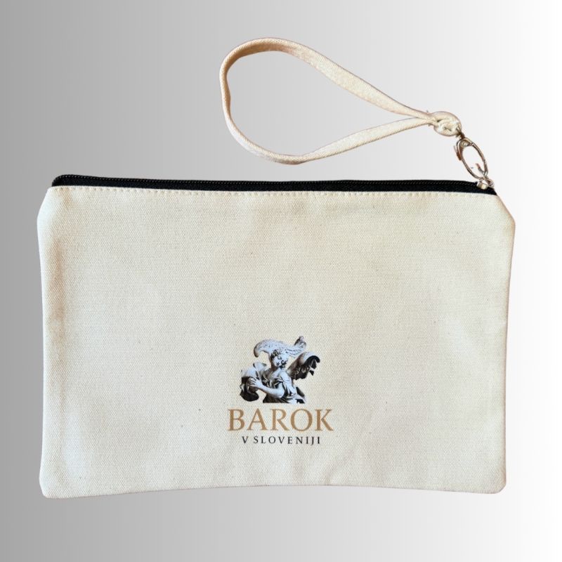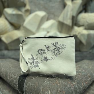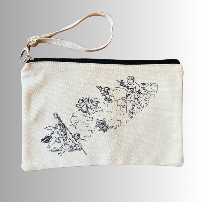 Manjša tekstilna torbica z motivom baročnih angelčkov – primerna za shranjevanje ličil, pisal, kartic ali drugih drobnarij. Elegantna zadrga, kakovosten tisk in nežen baročni motiv jo naredijo praktično in estetsko spremljevalko skozi dan.